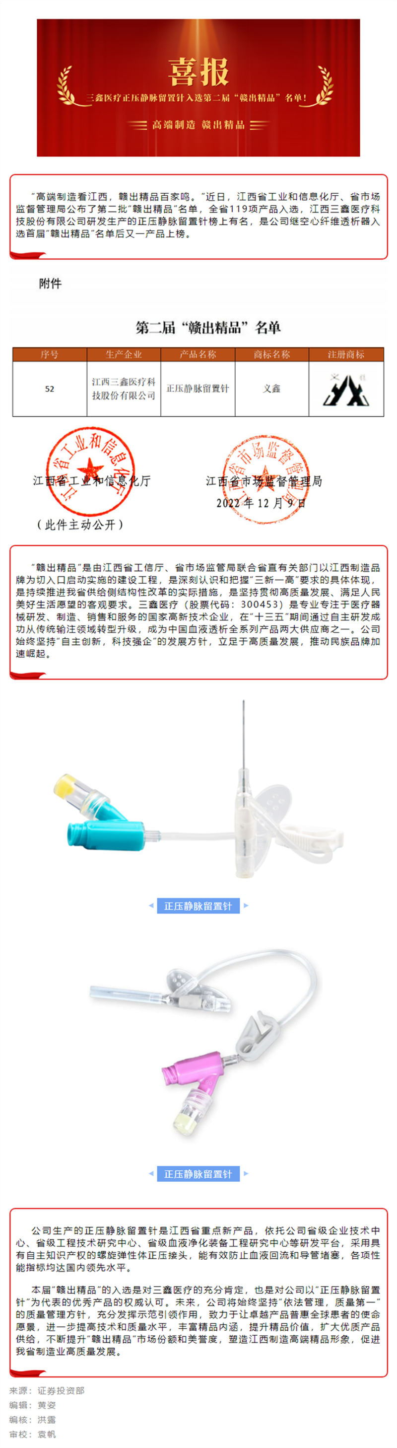 喜訊 | 香港馬買馬網(wǎng)站醫(yī)療正壓靜脈留置針入選第二屆“贛出精品”名單!